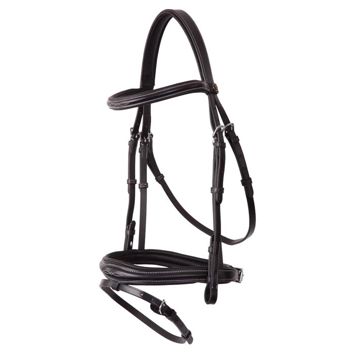 This symmetric bridle made of high-quality European leather features a headpiece with soft padding. The straight browband is round raised, softly padded and embellished with cream-coloured stitching. The throatlash can be adjusted on both sides. The cheekpieces are fitted with hook stud billets. The bridle has a flash noseband (approx. 3 cm) with cream-coloured stitching. This slightly shaped noseband is round raised and softly padded. The bridle has a V-shaped flash attachment and the buckle of the flash strap features an extra protection flap. The bridle features shiny, silver-coloured fittings made of chrome-plated brass. Supplied without reins.