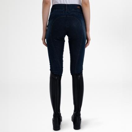 You’ll love the thoughtful details, including a secure two-hook and eye closure on the comfortable high waistband. Keep your essentials close at hand with the convenient phone pockets on both sides, while the subtle fake single welt back pockets add a touch of sophisticated flair. Of course, performance is paramount, and the silicone full grip ensures exceptional stability and connection with your mount, allowing you to focus purely on your ride. Elevate your equestrian wardrobe with these innovative and stylish denim breeches.