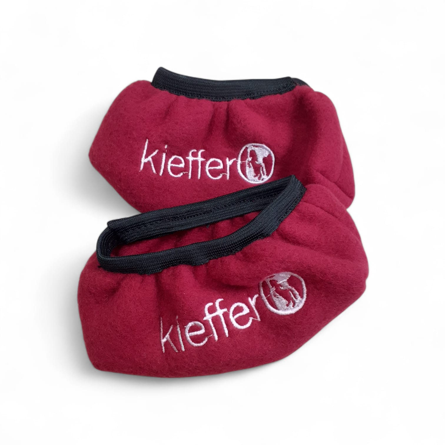 The practical small stirrup cover made of soft fleece protects the saddle from sand, dust and dirt. It is burgundy in colour with a black edging, embroidered with the Kieffer logo and fitted with an elasticated strap to attach it to the stirrup.