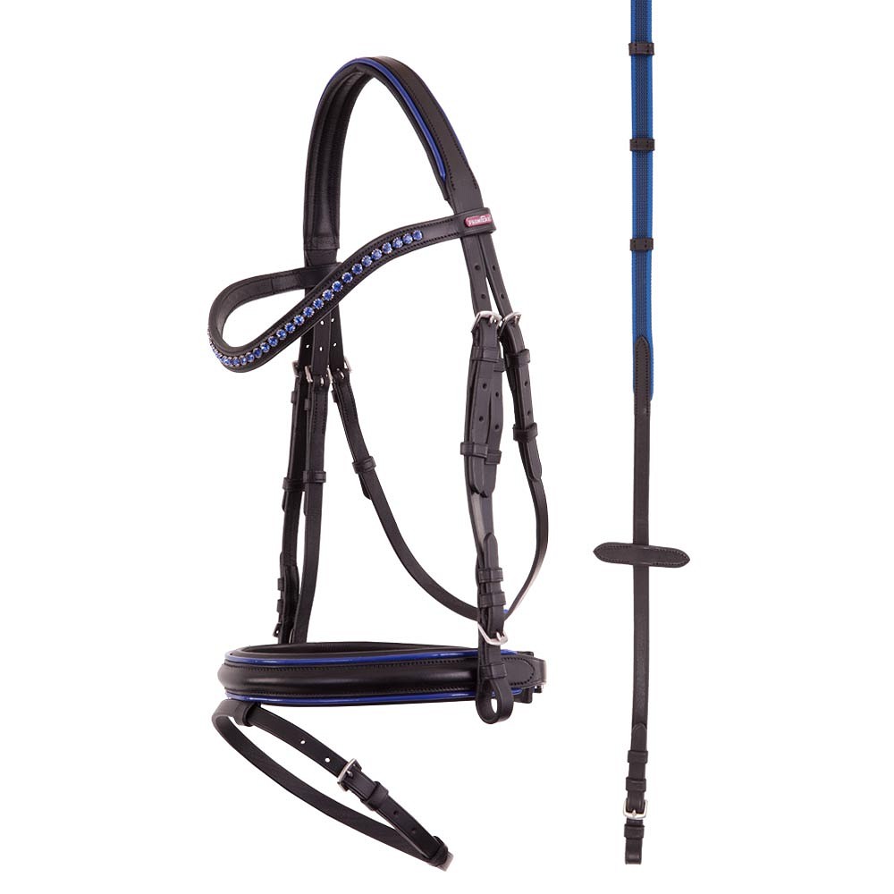 This symmetric bridle is made of beautifully finished leather. Its softly padded headpiece is cut back around the ears and embellished with patent leather piping in contrast colour. The curved browband is encrusted with coloured imitation diamonds and features soft leather facing. The throatlash can be adjusted on both sides and the cheekpieces are fitted with buckles. The bridle has a flash noseband (approx. 3.5 cm), which is embellished with double patent leather piping in contrast colour, similar to the headpiece. The noseband is round raised and softly padded. The bridle features shiny, silver-coloured fittings made of stainless steel and comes with web grip reins in a matching colour. The reins are woven through with rubber for additional grip. The reins feature hand and rein stops and are 20 mm wide.