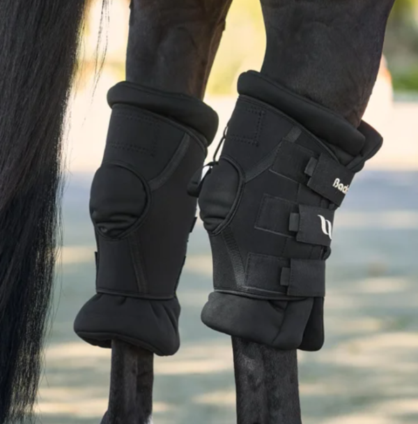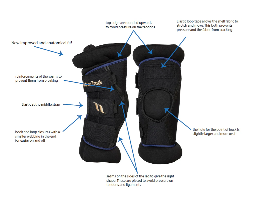 Aizsargi sastāv no divām daļām: izturīga un stabila ārējā apvalka un bieza iekšējā spilventiņa ar Welltex® tehnoloģiju. Royal Deluxe modelis ir anatomiski izstrādāts, lai nodrošinātu optimālu piegulšanu locītavas ārējam punktam. Ārējais apvalks ir labi veidots ar stratēģiski izvietotām vīlēm, lai izvairītos no spiediena punktiem uz zirga jutīgajām cīpslām. Iekšējais spilventiņš sniedzas augstu uz kājas ar noapaļotu formu, lai nodrošinātu vislabāko iespējamo komfortu. Spilventiņu var viegli noņemt, mazgājot zābakus, jo tie piestiprinās pie ārējās daļas ar āķa un cilpas aizdari. Iekšējam spilventiņam ir Welltex®odere. Materiāls atstaro ķermeņa siltumu tālā infrasarkanā starojuma veidā. Tas var stimulēt asinsriti šajā zonā un mazināt problēmas ar stīvumu, iekaisumu un osteoartrītu. Aizsargi ir aprīkoti ar trim izturīgām un ilgmūžīgām āķa un cilpas siksnām. Vidējai siksnai ir divdaļīga elastīga lente, lai izvairītos no spiediena uz locītavu. Aizsargi ir piemēroti lietošanai atpūtas laikā stallī vai transportēšanas laikā.