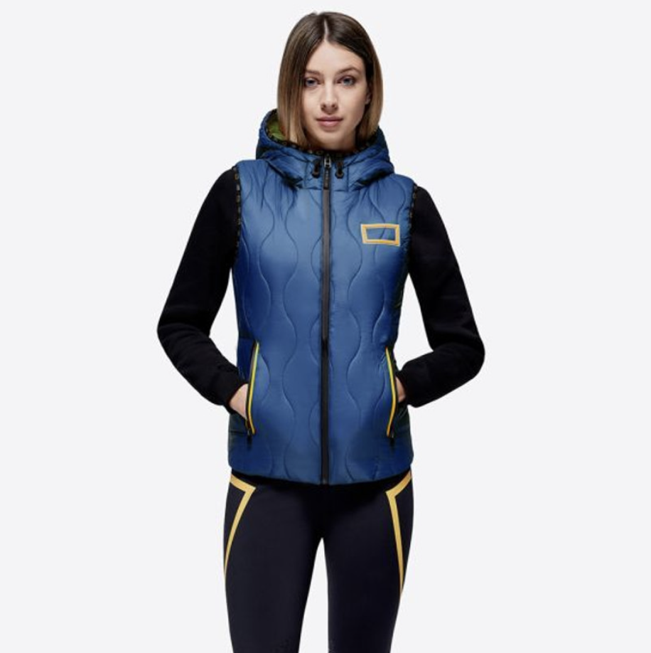 Stepēta veste ar kapuci, kapuci var nostiprināt uz muguras.